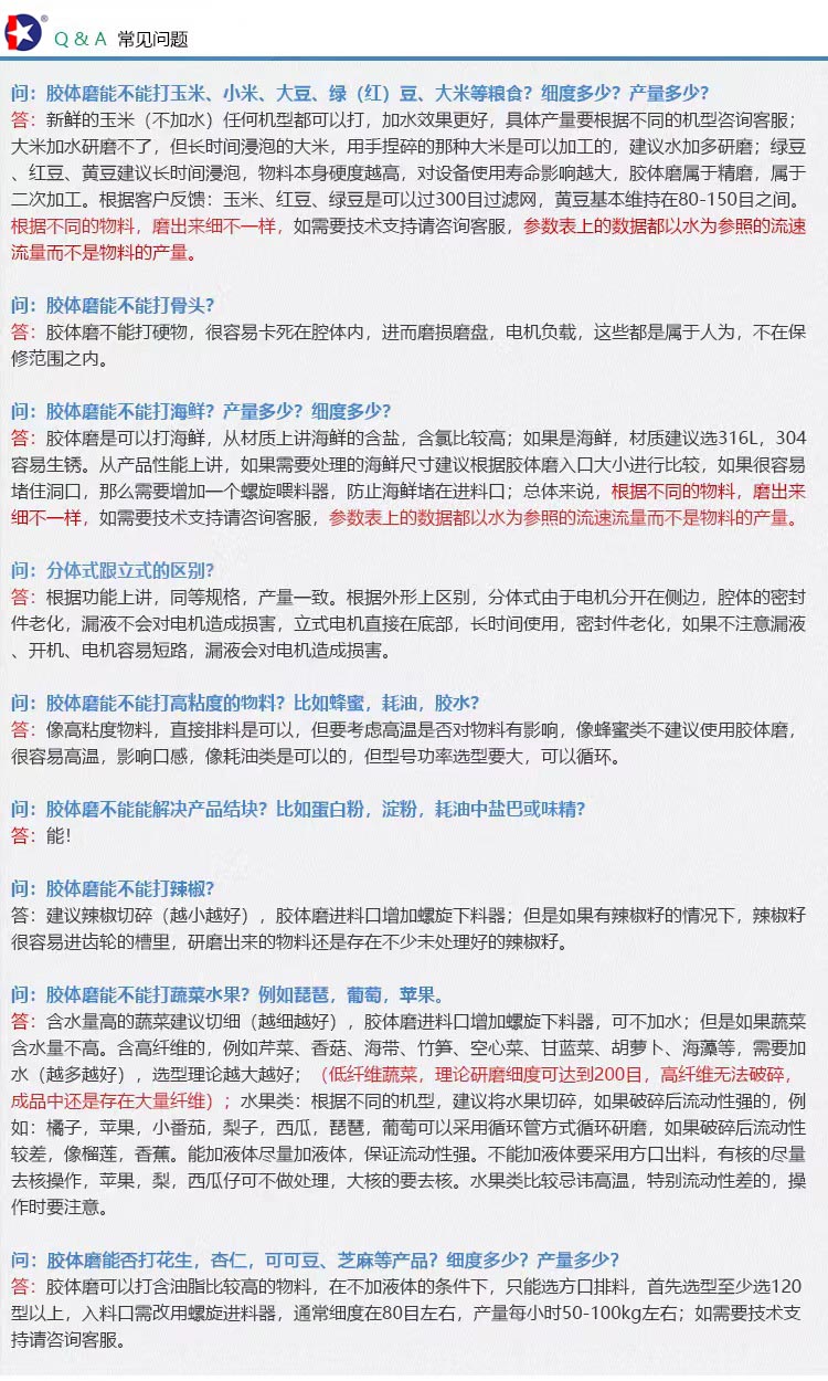 可代替并優(yōu)于石磨,砂磨機(jī)、球磨機(jī)、乳勻機(jī)、乳化機(jī)、三輥機(jī)、搗碎機(jī)等工作。亦可按照客戶對(duì)加工物料不同的酸度、堿度、濃稠度等性質(zhì)特殊要求定制生產(chǎn)。