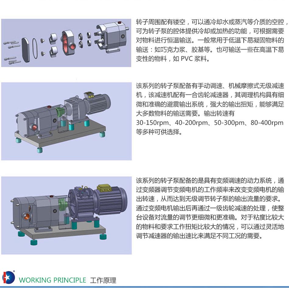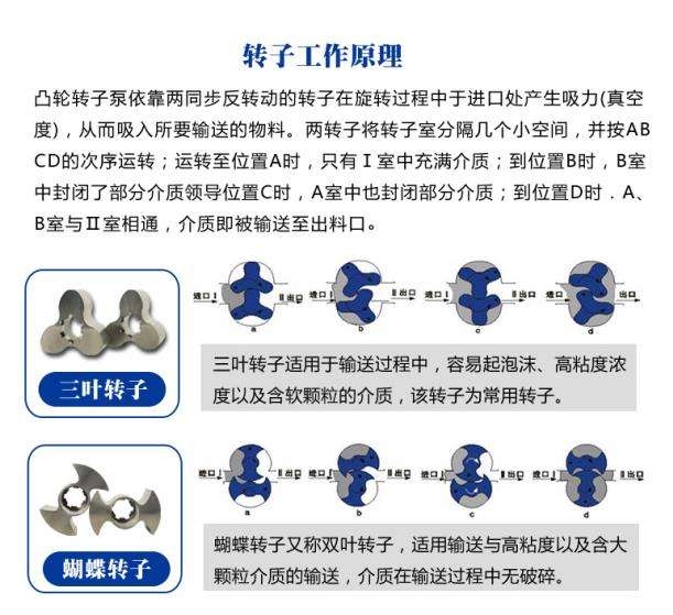 轉(zhuǎn)子泵采用的二葉、三葉、碟形、多葉型的轉(zhuǎn)子,是一種多用途的容積式輸送泵。它具有轉(zhuǎn)速低、輸出扭矩高、耐高溫、耐腐蝕等特點(diǎn),是一種衛(wèi)生型的容積式輸送泵。其獨(dú)特的工作原理和特點(diǎn)體現(xiàn)在輸送高粘度、高溫度、高腐蝕性的物料中,其輸送過(guò)程平穩(wěn)、連續(xù),并且能夠保證物料在輸送過(guò)程中物理性能不被破壞,可輸送物料的粘度,可高達(dá)1,000,000CP。