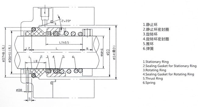 單端面、非平衡型、錐形彈簧傳動(dòng)結(jié)構(gòu),彈簧另一端并圈鎖定在軸上,彈簧旋向與泵軸旋向有關(guān)。