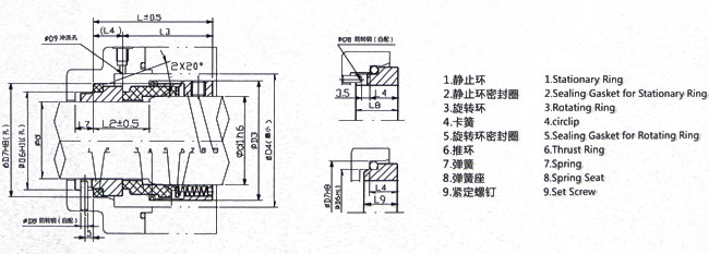 HS59B系列機(jī)械密封采用聚四乙烯、填充聚四氟乙烯或柔性石墨制作的楔形環(huán)作輔助密封圈,提高了密封的使用溫度和耐磨性。